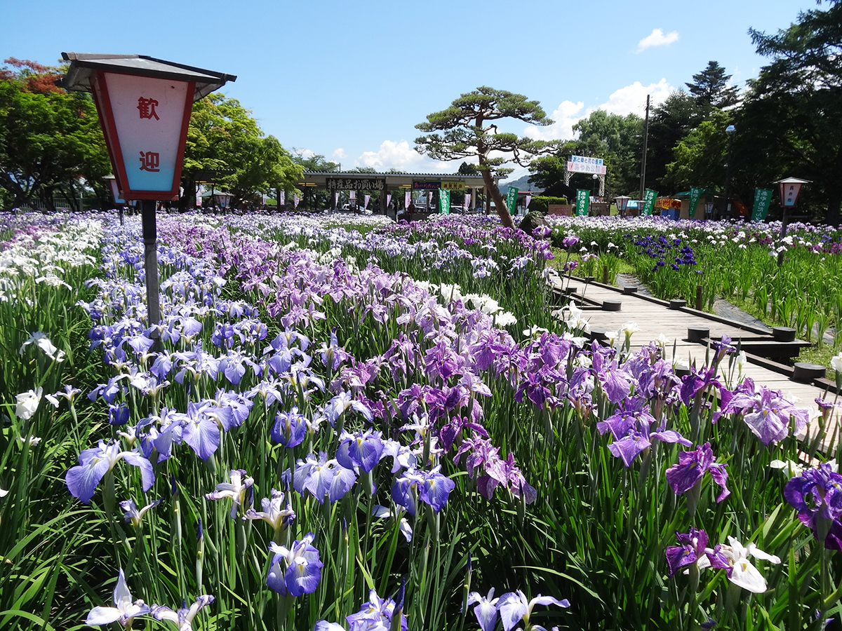 このあやめ公園では、毎年6月中旬~7月上旬まであやめまつりを開催しています。園内では様々なイベントが行われ、あやめ苗や長井のおいしいものもたくさん販売しています。